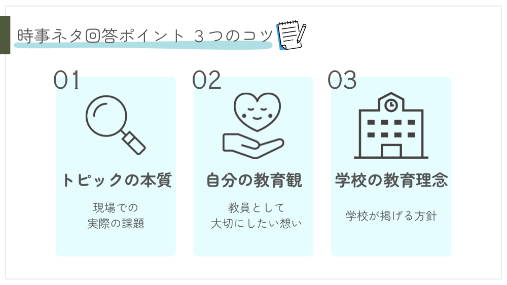 「世の中では【トピック】が話題になっているけど、私は【自分の価値観】を大切にしたいんです。これってあなたの学校の【学校の教育理念】とピッタリですよね?だから私はこの学校で働きたいんです!!!」