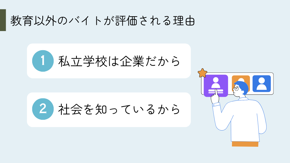 私立学校の人事は、教育系のアルバイト以外の経験を持つ学生にも注目しているのです。