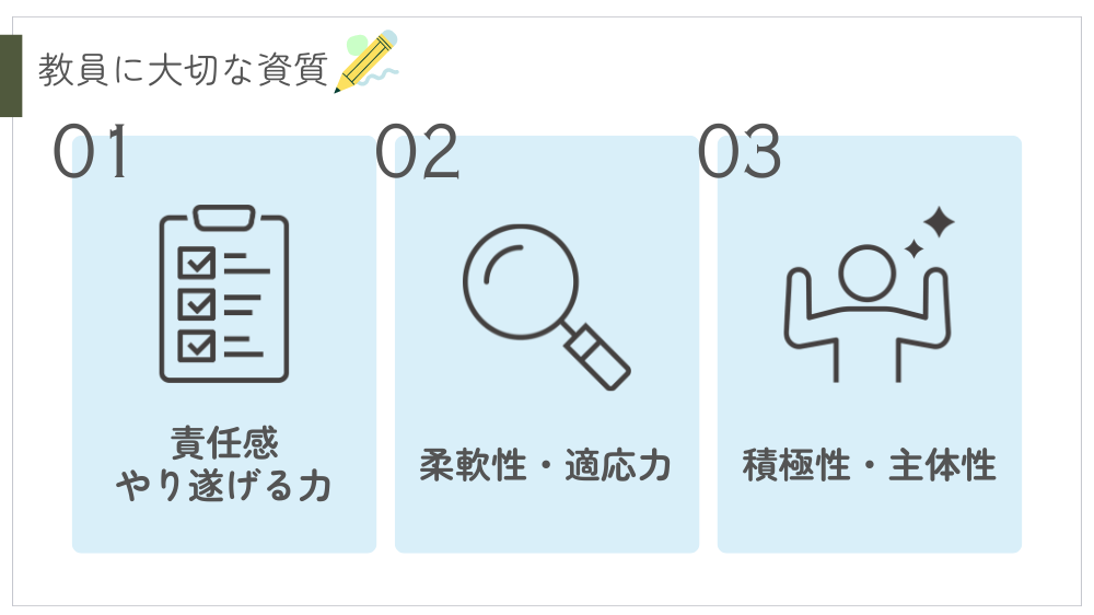 それでは、ガクチカを聞いている面接官が見ている、教員に必要な3つの必須資質について、それぞれ解説していきます!