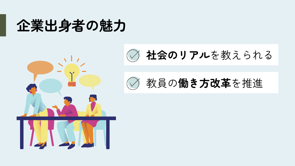でも実は、そんな心配全くいりません!むしろ企業での勤務経験を活かすことで教員として活躍することだってできるのです!