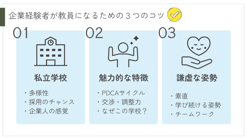 それではここから、教育学部で勉強していない、一般企業で経験を積んだあなたが教員採用試験で合格できるコツを3つご紹介していきます!