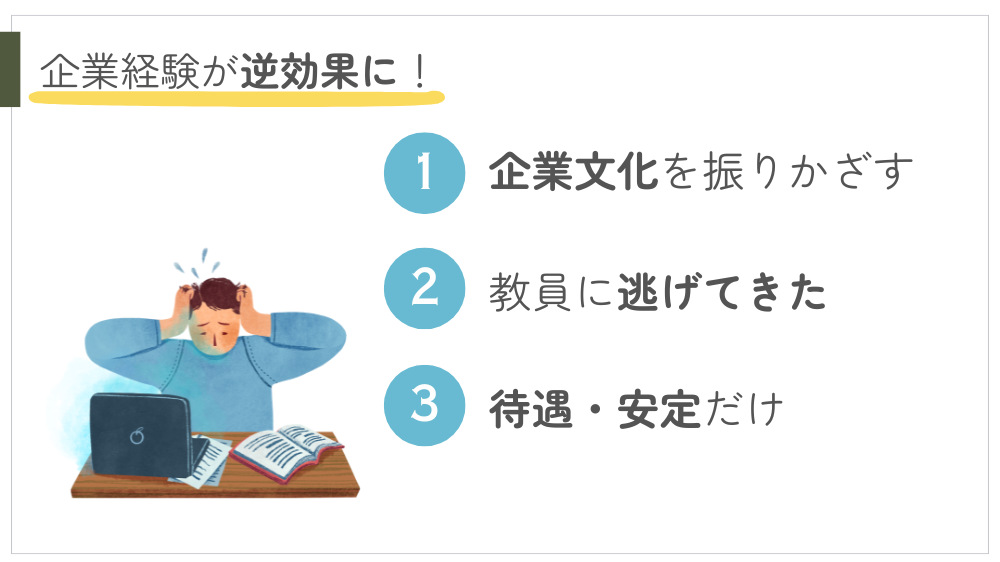 「企業でのやり方を絶対視して、学校文化や既存の教員のやり方を否定するのでは?」「謙虚さや協調性がない!」