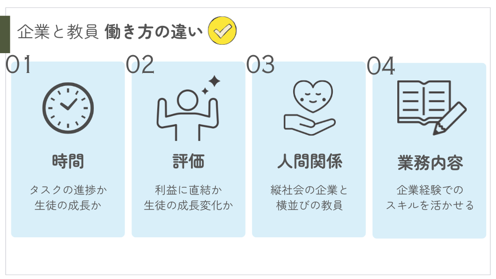 今回は「教員vs社会人」ということで、企業での働き方と教員の働き方のリアルな違いを学校人事担当目線でご紹介してきました。