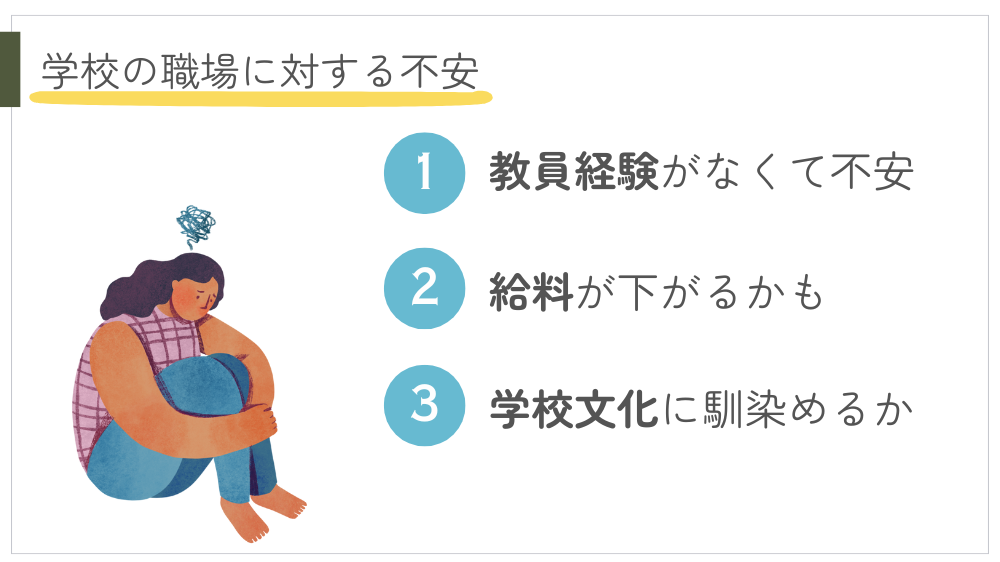 これまで私自身、学校採用担当として多くの企業出身の方と接してきましたが、多くのみなさんが共通して抱えている不安とその対処法を一緒にご紹介していきます!