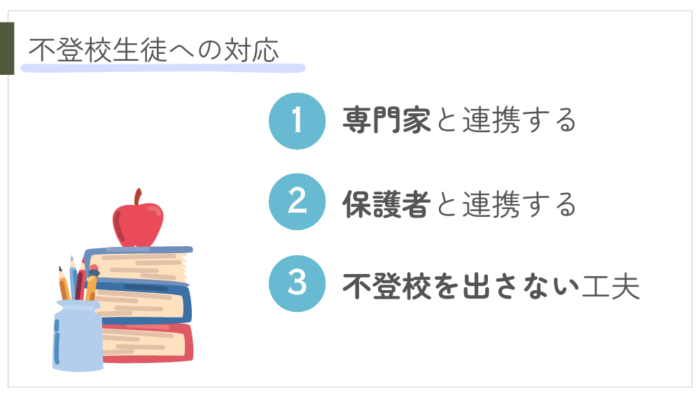 スクールカウンセラーやスクールソーシャルワーカーなどの専門家とも連携をして、積極的に生徒や保護者のサポートをしていく姿勢があることを伝えましょう。