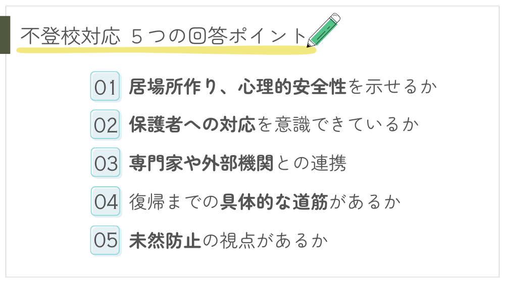 この5つの視点を回答に盛り込むことで、不登校への対応力が面接官に評価されるようになりますよ。